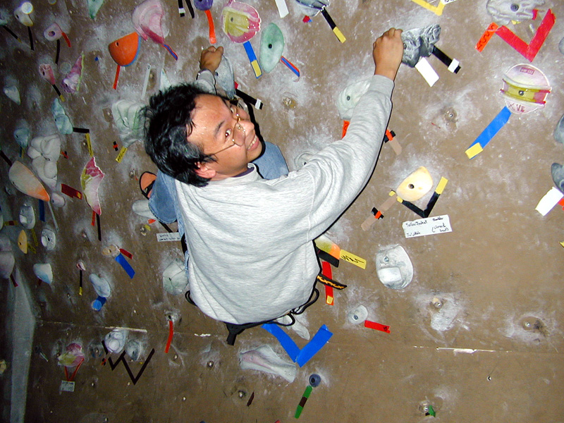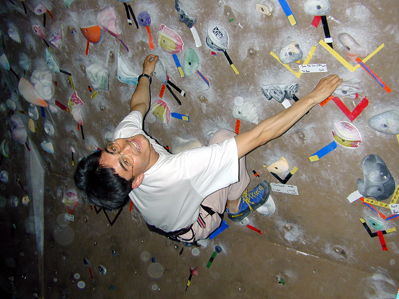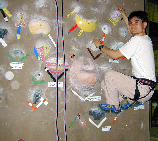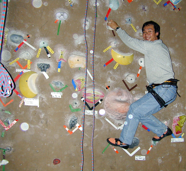 My friend Michio and I did some climbing in the indoor climbing gym at the University of Colorado's recreational center. It was great fun. We used harnesses and ropes to climb all the way up to the top of the walls. We decided it was too inconvenient and unsafe to take photos of each other when we were that high above the ground. So instead, we took photos of each other lower to the ground. Normal sport shoes are not very useful for climbing the walls because the soles are too soft, and they just slip off the rocks. We have to use climbing shoes with hard and sticky rubber soles that provide quite a superior foothold.