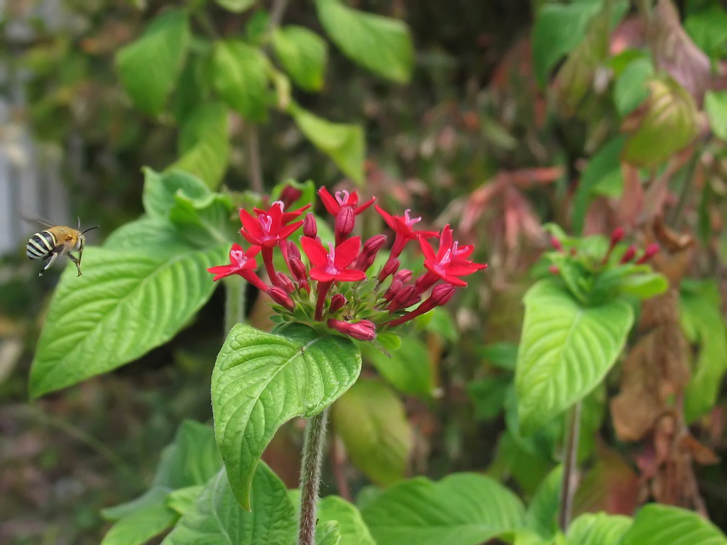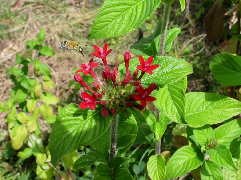 A blue-banded bee with yellow stripes hovering at the flower.