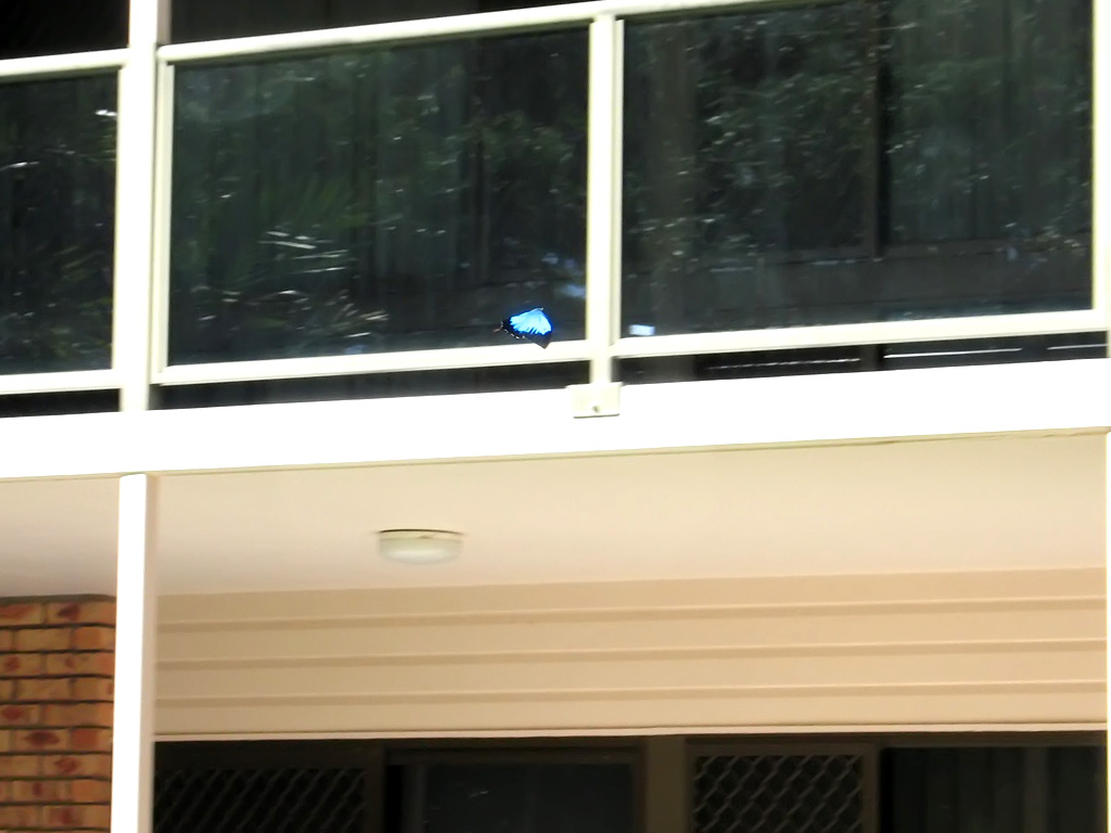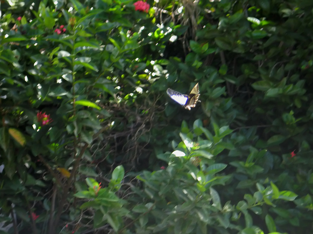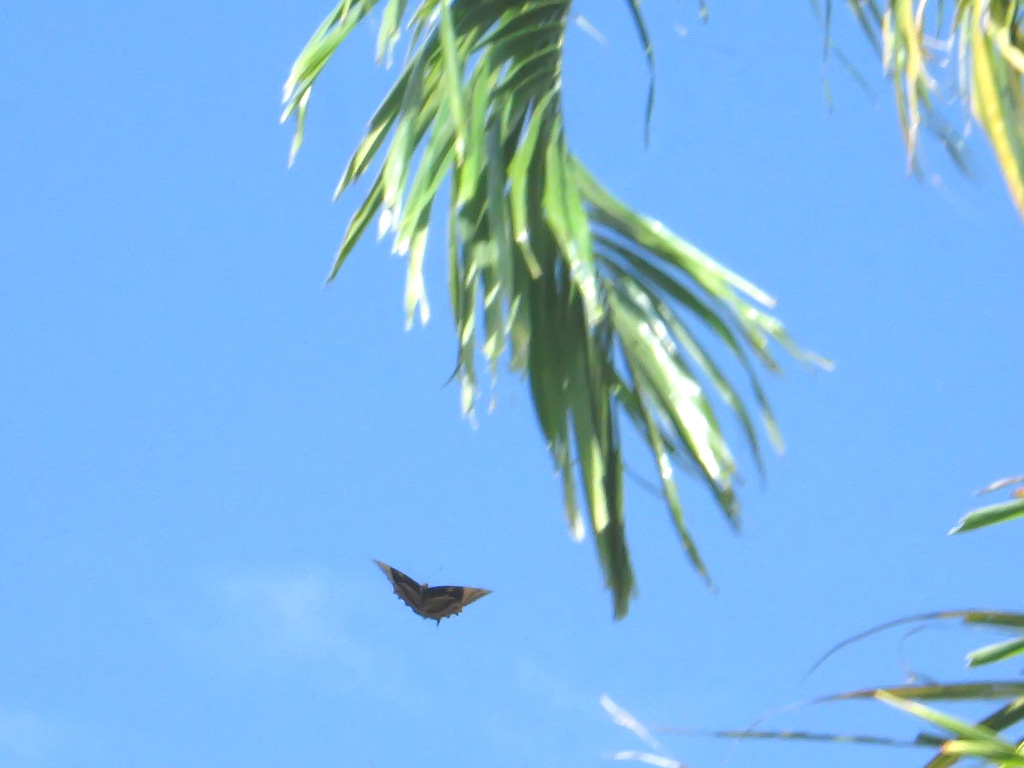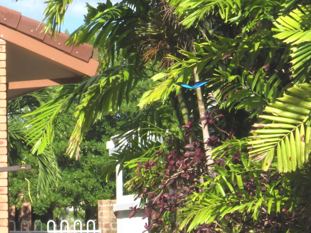 The ulysses butterfly is visible around the top-right corner of this photo. The butterfly is actually quite large, even though it appears to be small since it is far away from the camera.