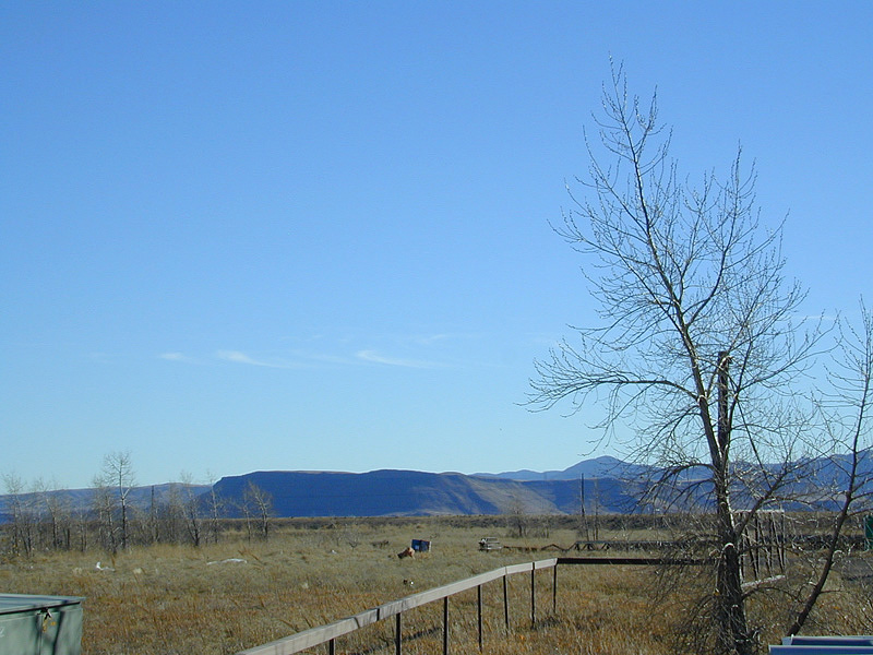 Looking towards the south-west, a hill in the background with a flat top. The word for these kinds of hills with a flat top is 'mesa'...pronounced 'may-sar'.
