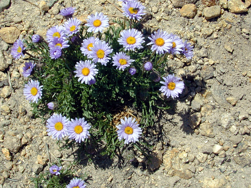 The daisy flowers at the lower elevations had white petals, but as we reached higher elevations, they had purple petals like these ones. There's a bee on one of the flowers.